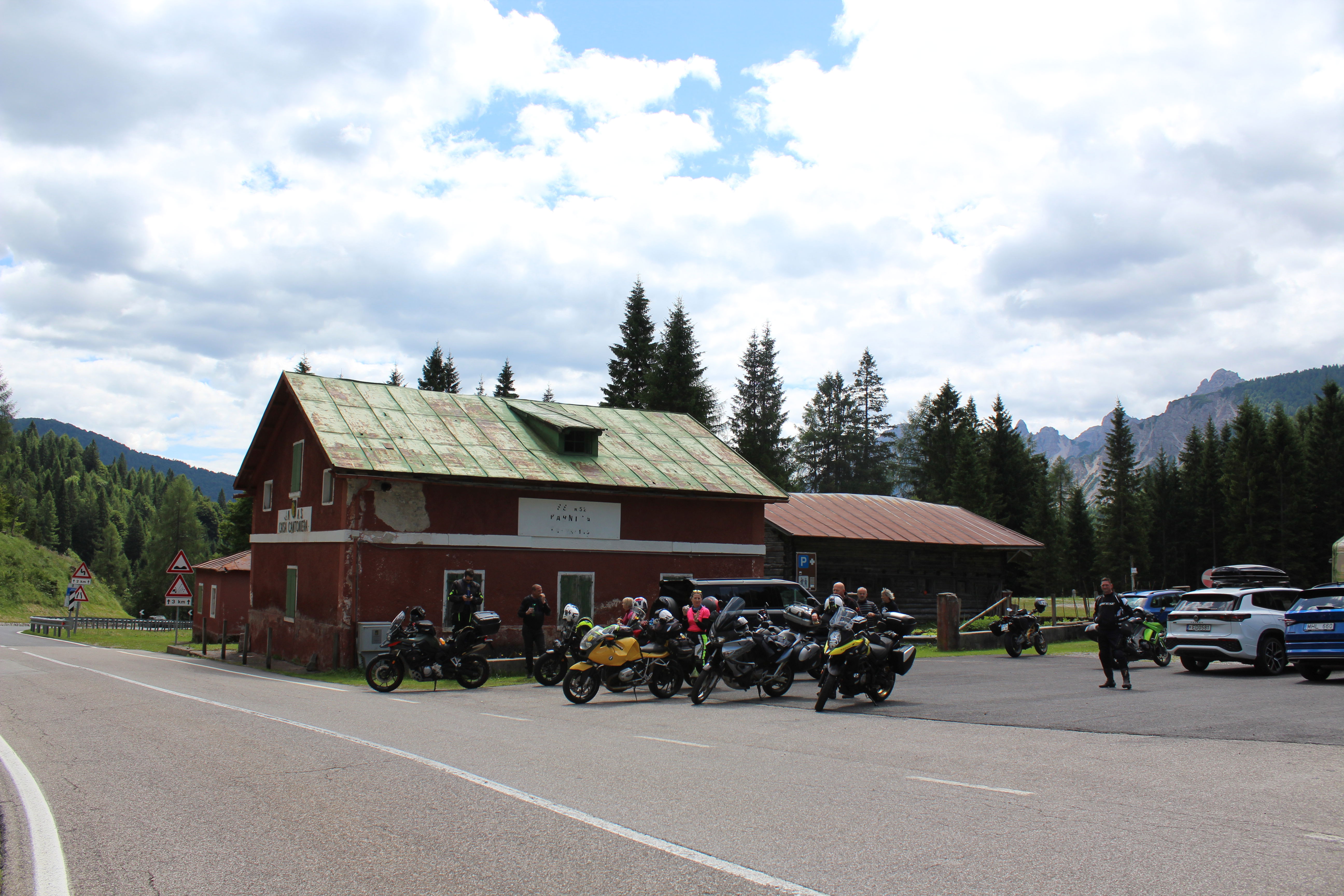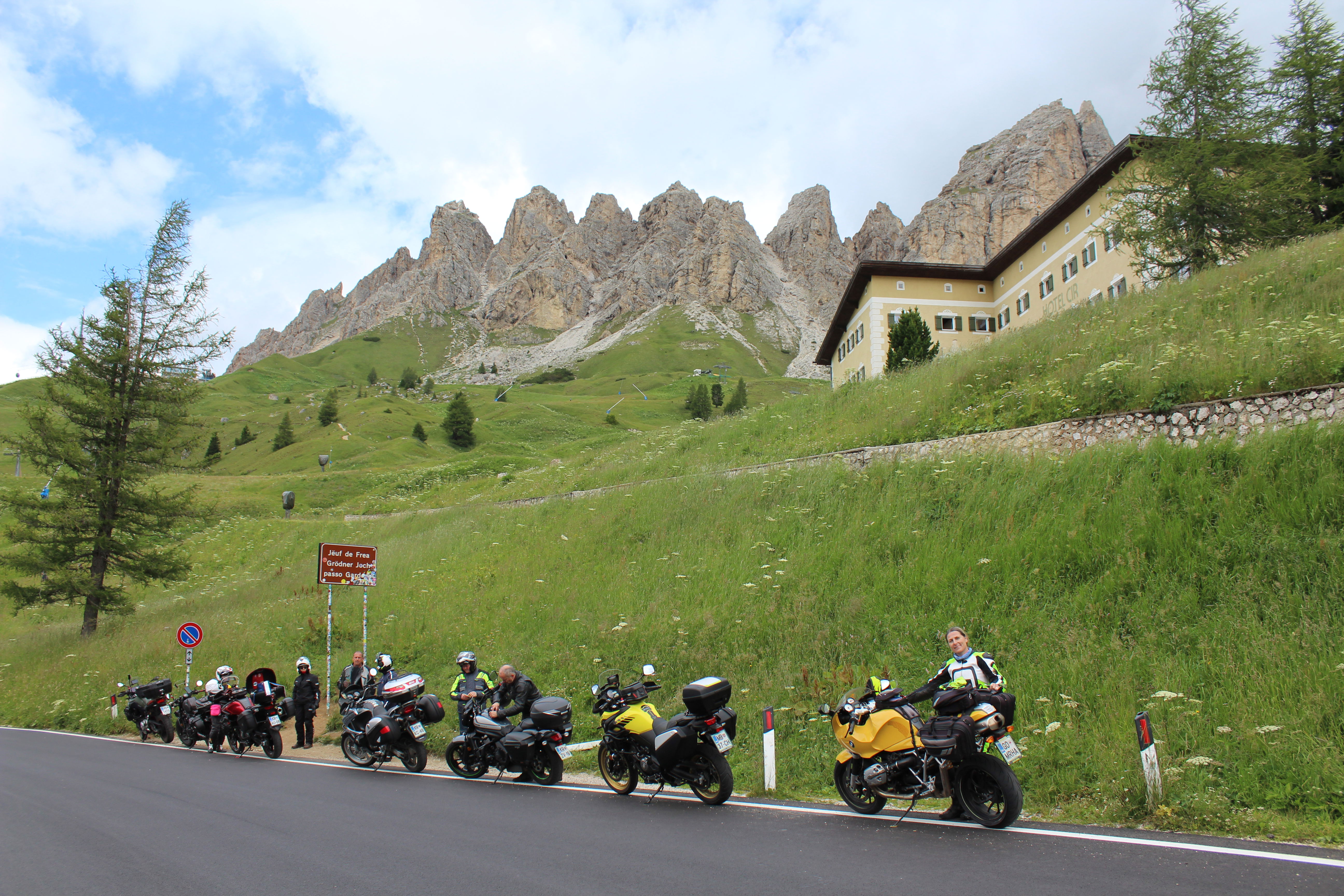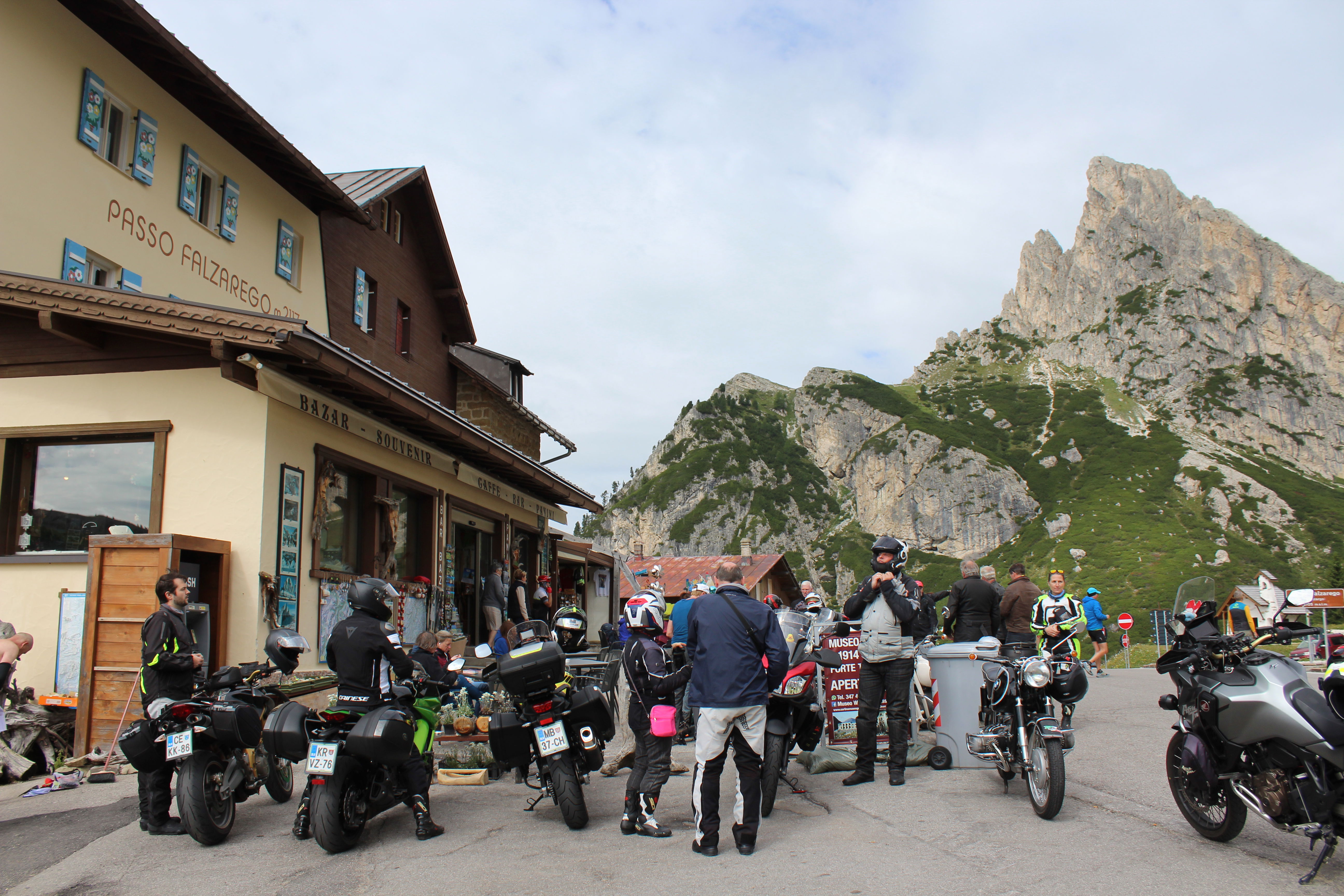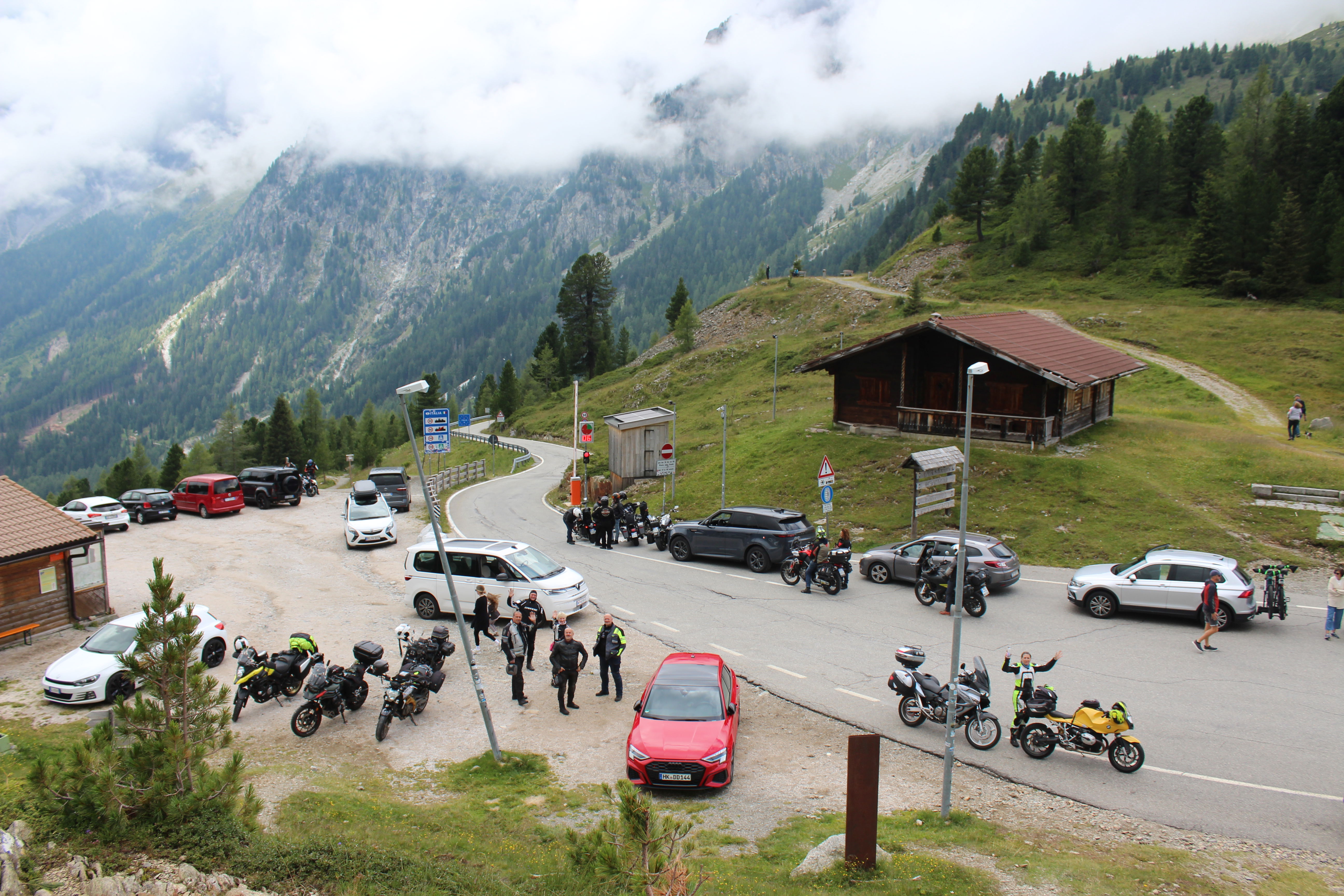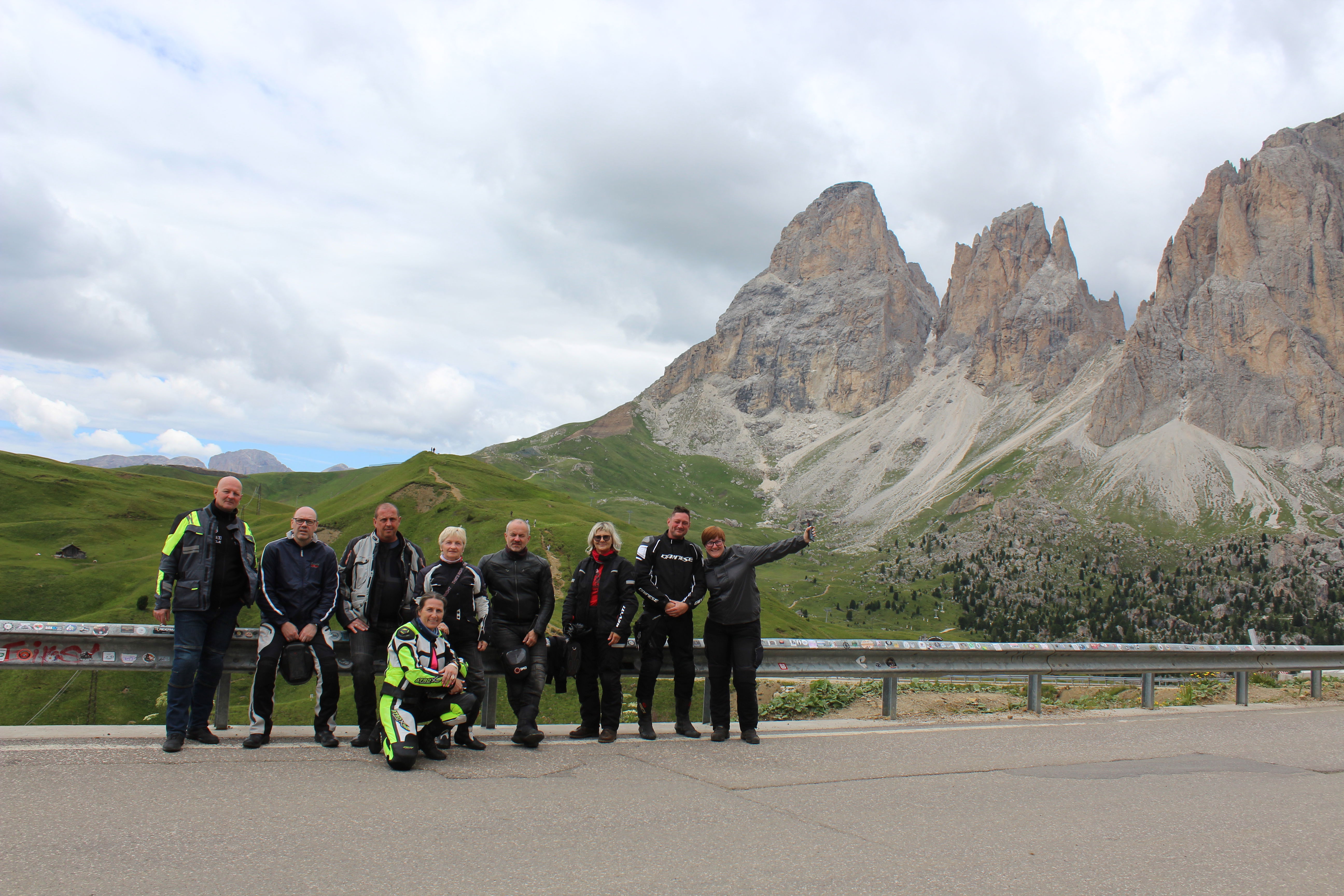 Na Poti na prelaz Gardena imamo kar gnečo, prehitevanje pa nam še dodatno otežujejo vse pogostejše policijske kontrole. Tu se lahko zahvalimo večini nasproti vozečih motoristov, ki nas na kontrole še pravočasno opozorijo s tapkanjem po svojih čeladah (mednarodni znak med motoristi za: “pazi, policija!”). Na prelaze imamo navado, da se peljemo vsak po svoje, na vrhu pa se počakamo. In glej ga zlomka, ko pridemo do vrha tega prelaza, eden od naših manjka. Kakopak, prehiteval je na neprimernem mestu in ustavila ga je policija. Tako to je, vsaka šola nekaj stane. Seveda ga počakamo in se na koncu pošalimo, da bo danes dal za rundo. V kolikor koga zanima, za prehitevanje na neprimernem mestu je plačal 60€ kazni.