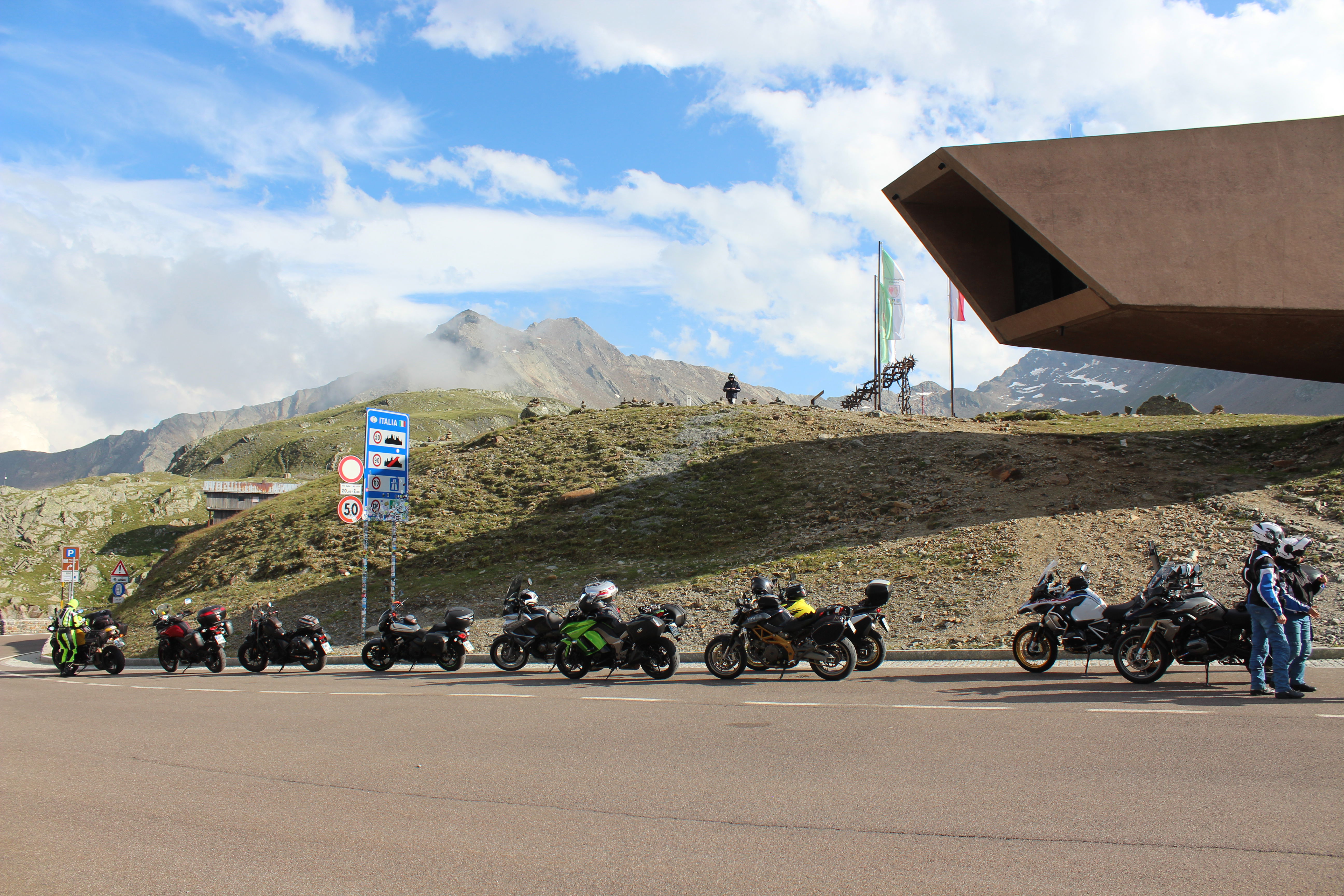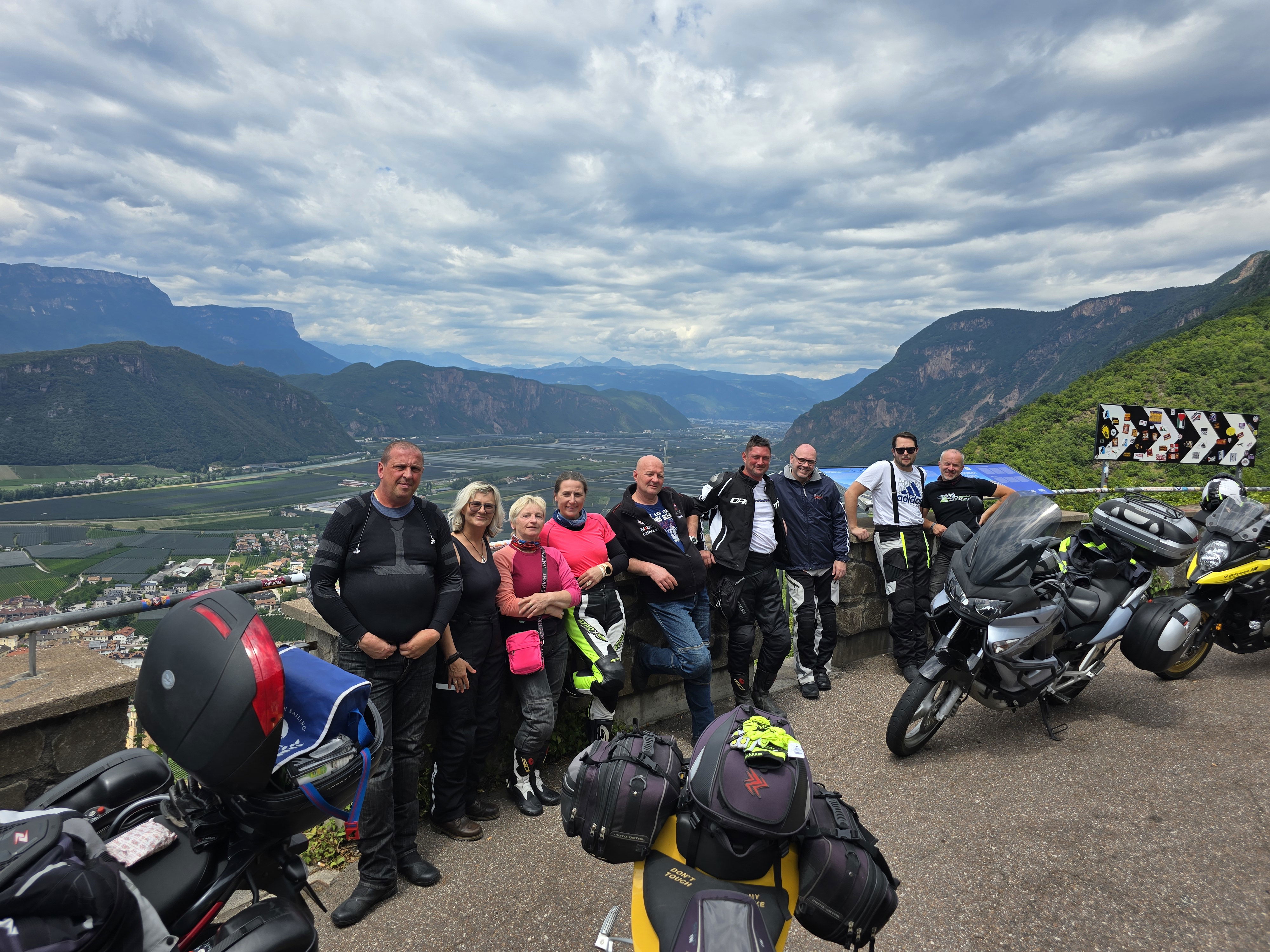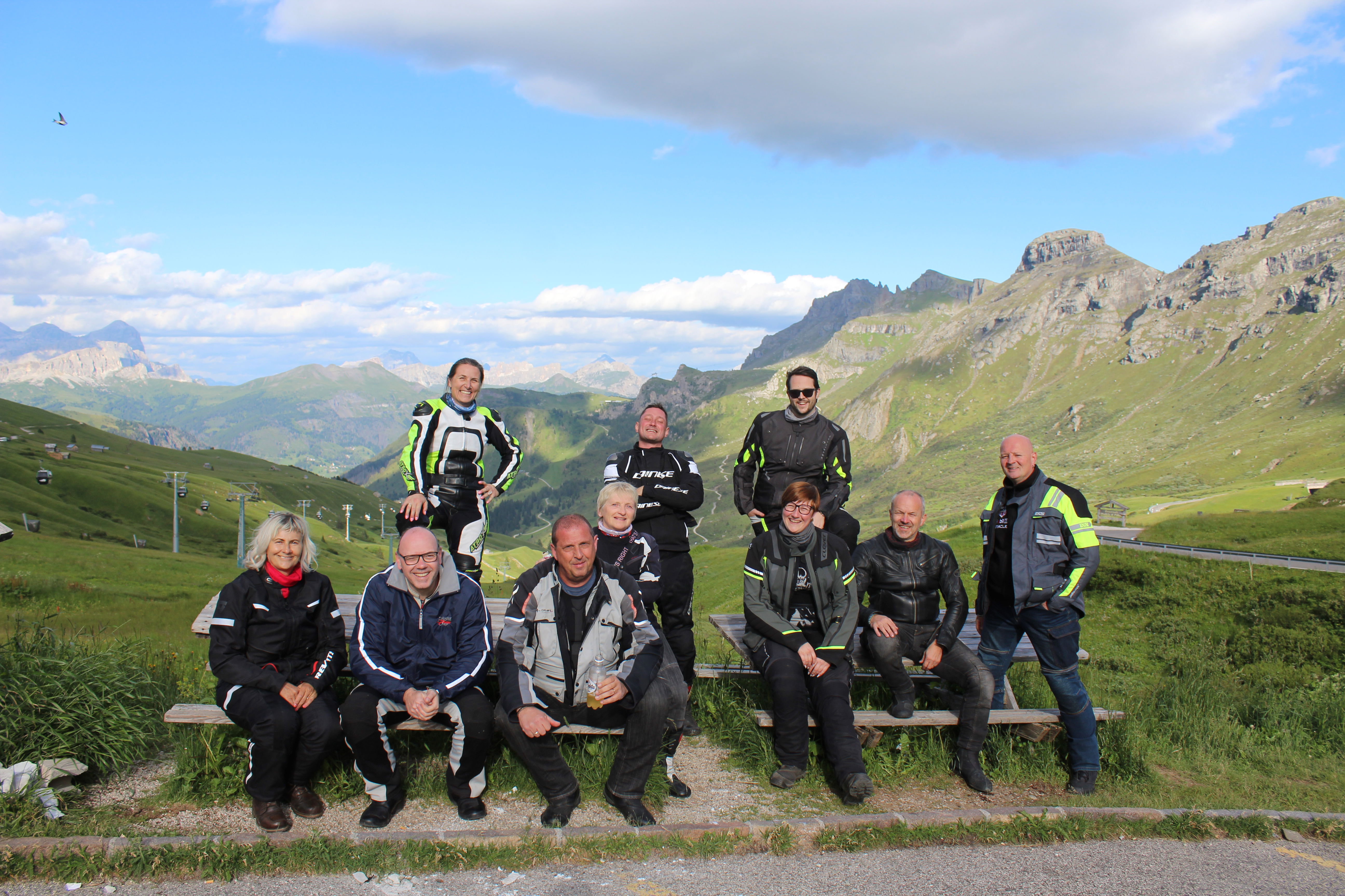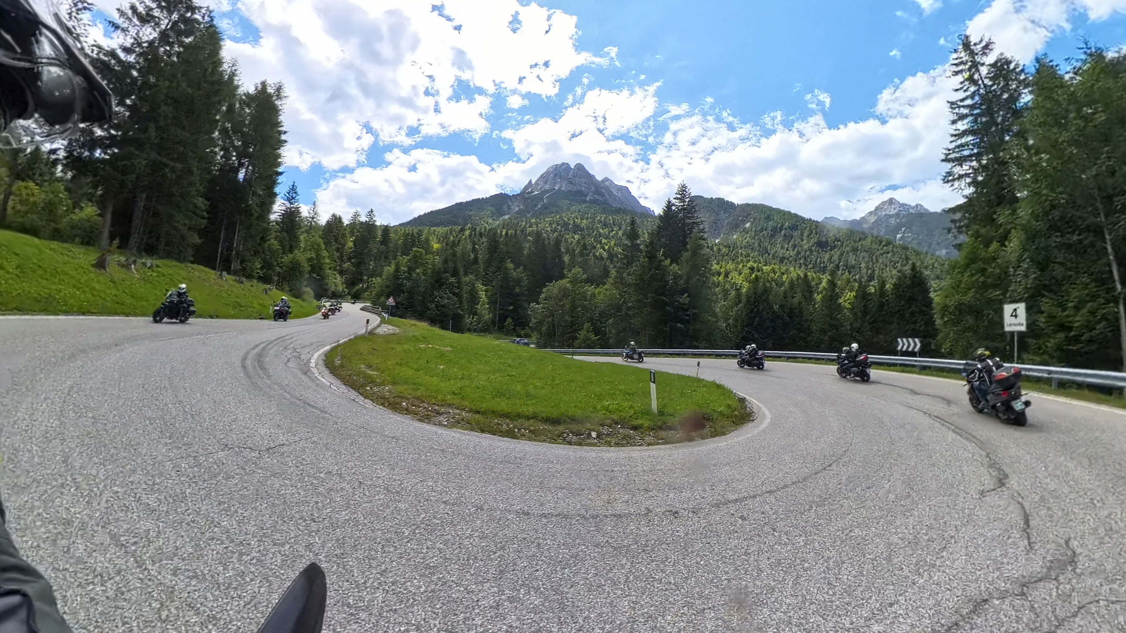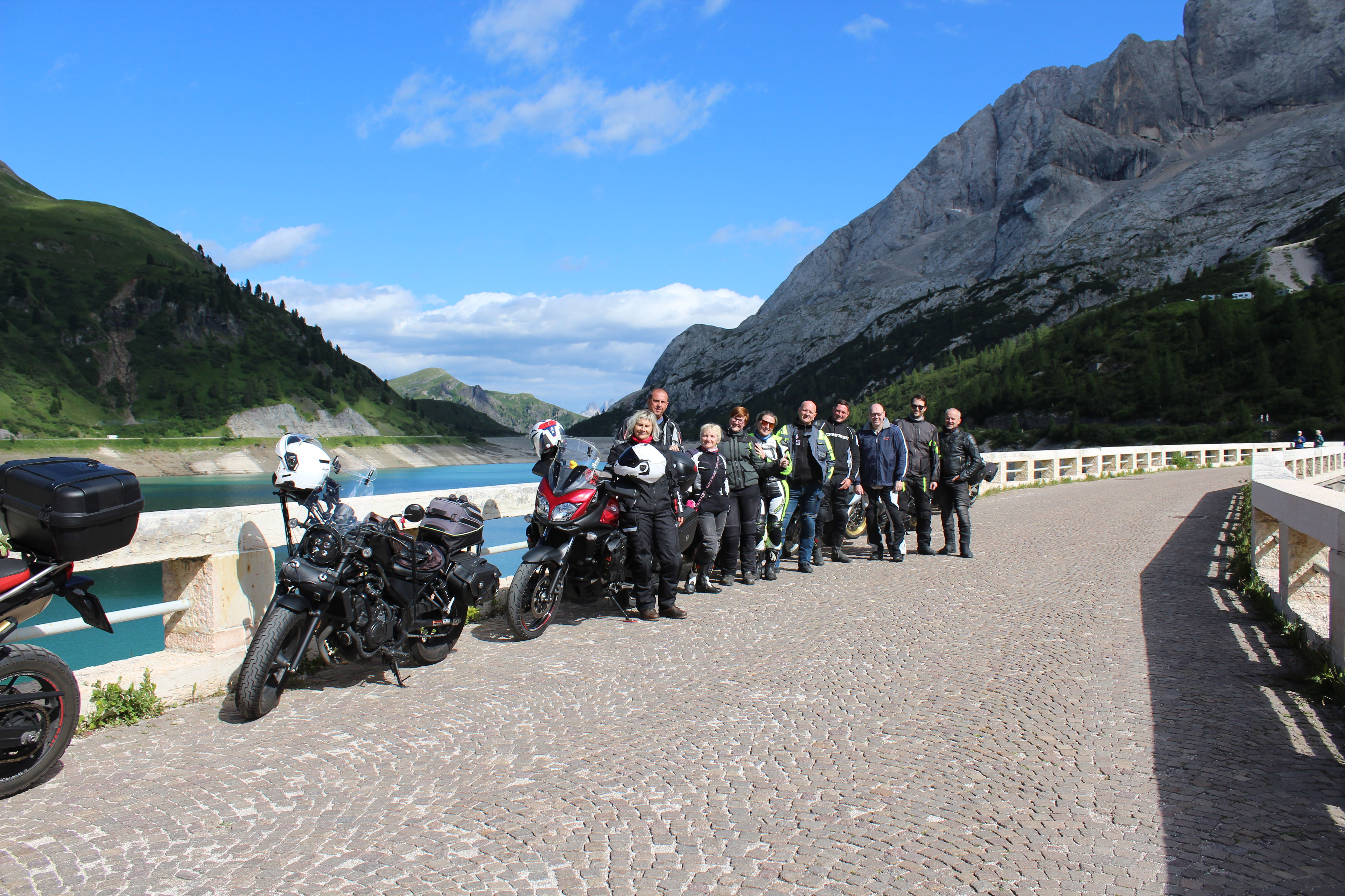 Na Poti na prelaz Gardena imamo kar gnečo, prehitevanje pa nam še dodatno otežujejo vse pogostejše policijske kontrole. Tu se lahko zahvalimo večini nasproti vozečih motoristov, ki nas na kontrole še pravočasno opozorijo s tapkanjem po svojih čeladah (mednarodni znak med motoristi za: “pazi, policija!”). Na prelaze imamo navado, da se peljemo vsak po svoje, na vrhu pa se počakamo. In glej ga zlomka, ko pridemo do vrha tega prelaza, eden od naših manjka. Kakopak, prehiteval je na neprimernem mestu in ustavila ga je policija. Tako to je, vsaka šola nekaj stane. Seveda ga počakamo in se na koncu pošalimo, da bo danes dal za rundo. V kolikor koga zanima, za prehitevanje na neprimernem mestu je plačal 60€ kazni.