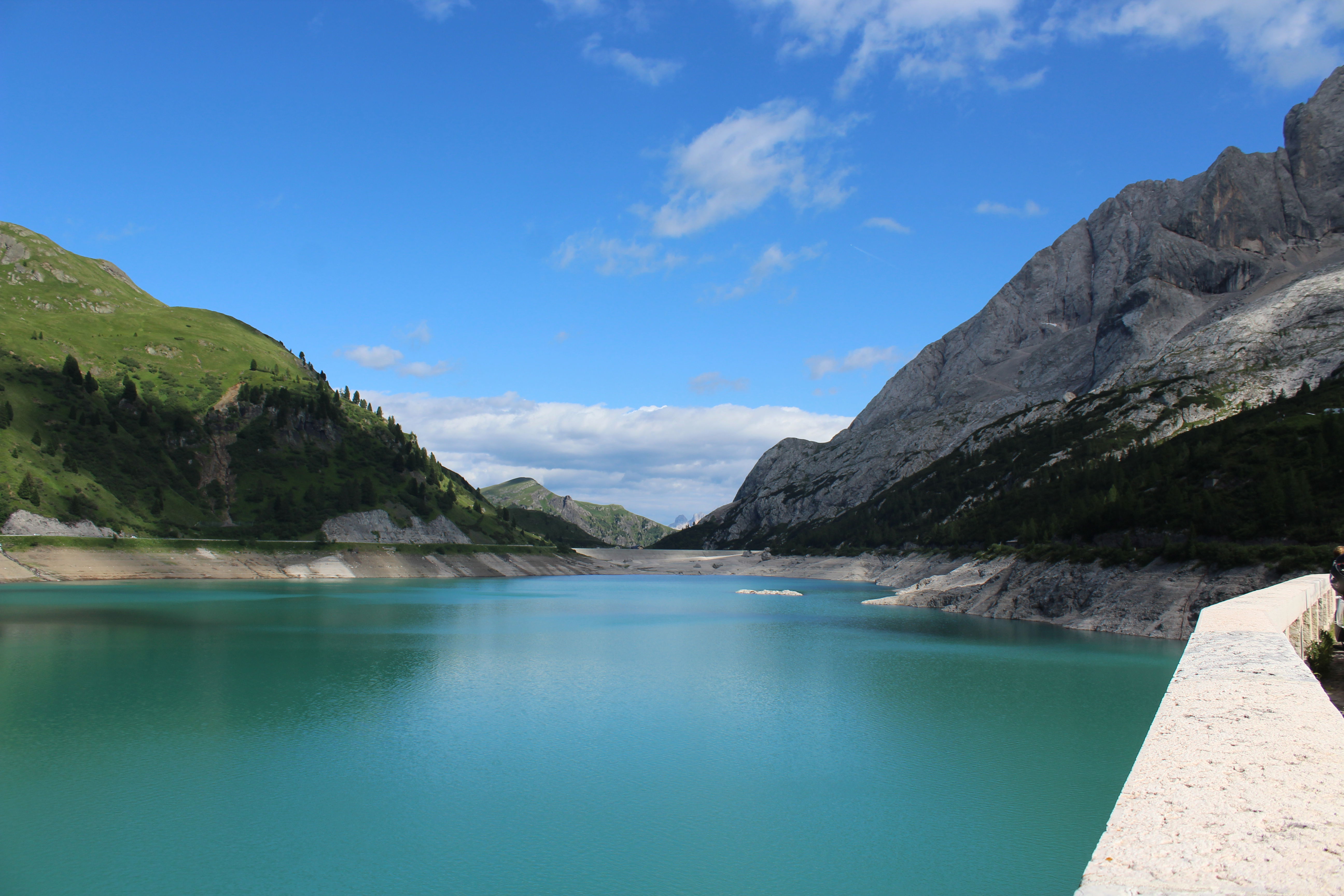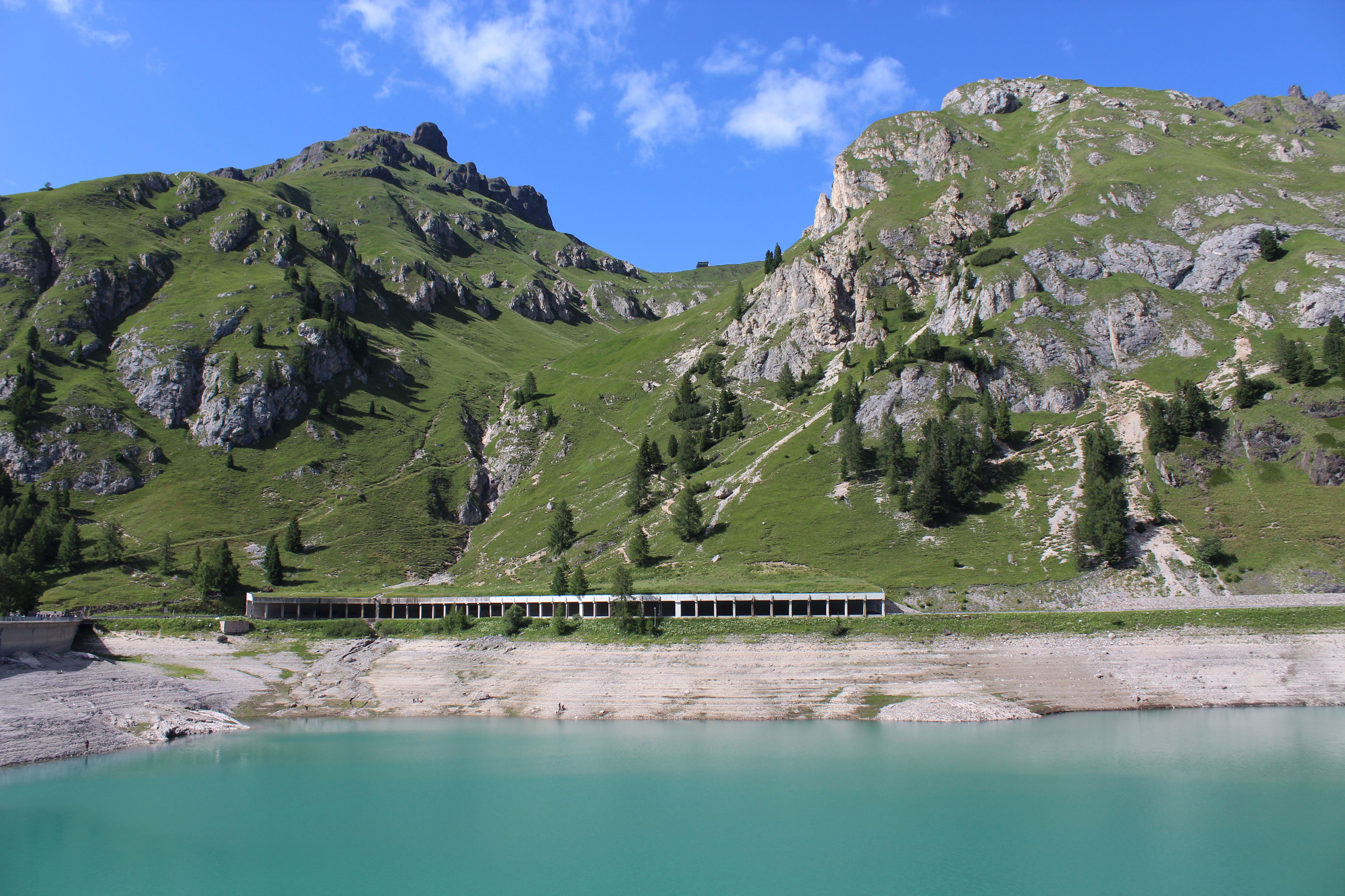 Kot vedno se ustavimo na jezu na vrhu prelaza in občudujemo okolico. Proti jugu imamo pogled na ledenik na Marmoladi, proti severu pa pogled na zelen gorski greben med prelazoma Fedaia in Pordoi.