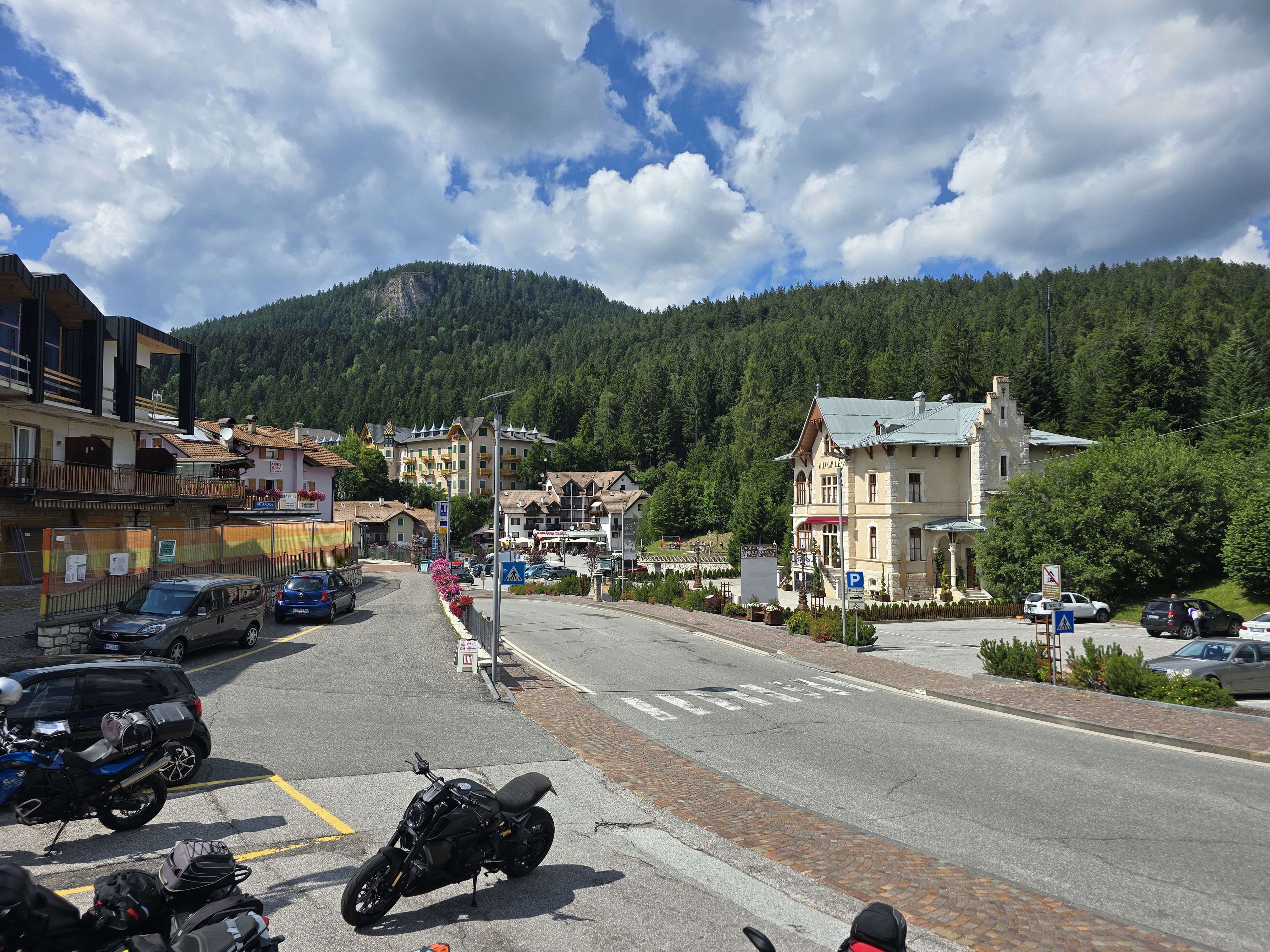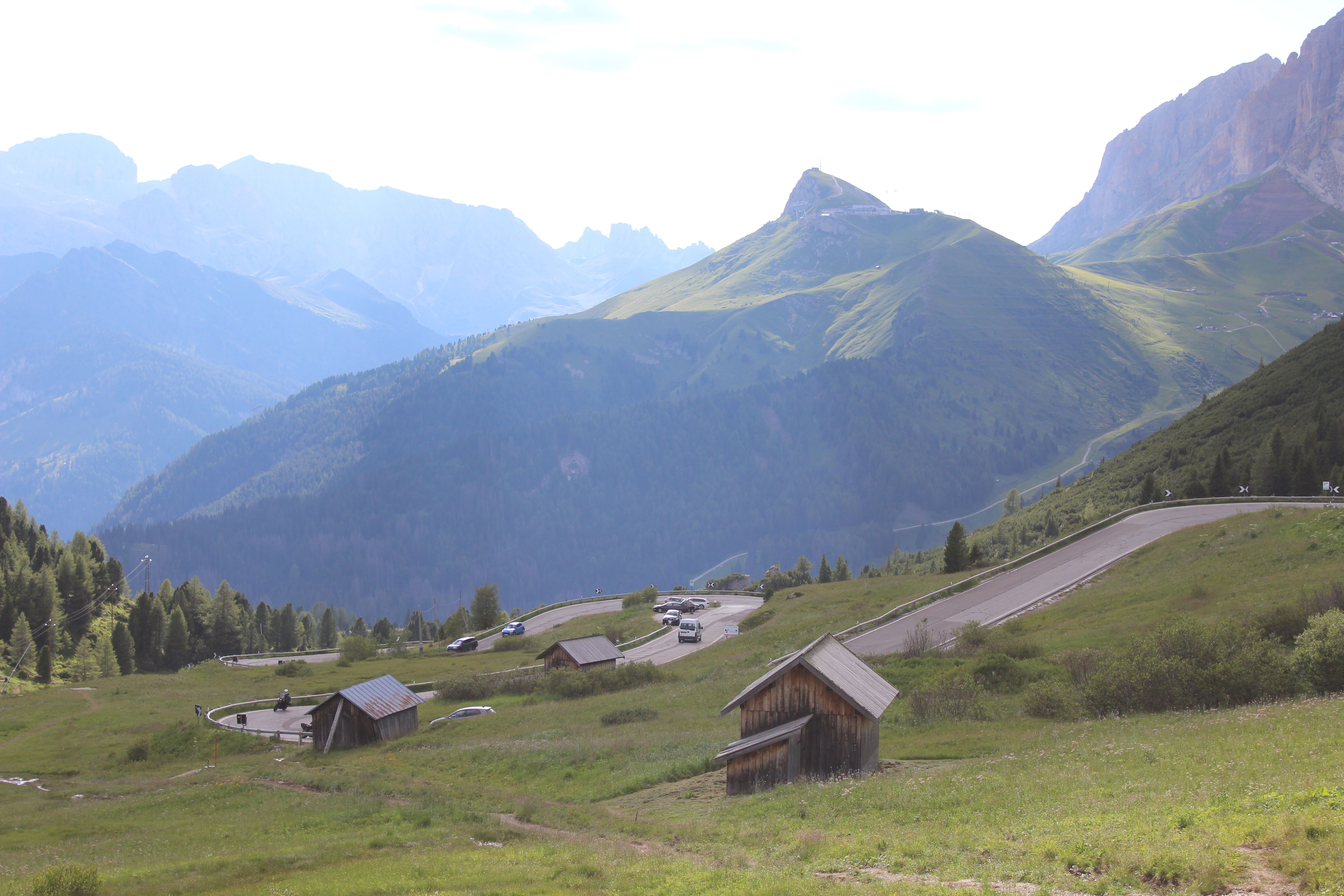 Spustimo se v, s turisti nagneten, Canazei. Stežka se prebijemo do bencinske črpalke, a tako je v Dolomitih, moraš imeti kar nekoliko preračunano, kje boš tankal. Tudi na črpalkah je treba biti pozoren, saj je običajno ena vrsta točilnih postaj samopostrežna in cenejša, v drugi vrsti pa ti bencin natoči tamkajšnji zaposleni, cena pa je 20 centov na liter višja. Natočimo polno in jo mahnemo nazaj v hrib, na prelaz Pordoi.
