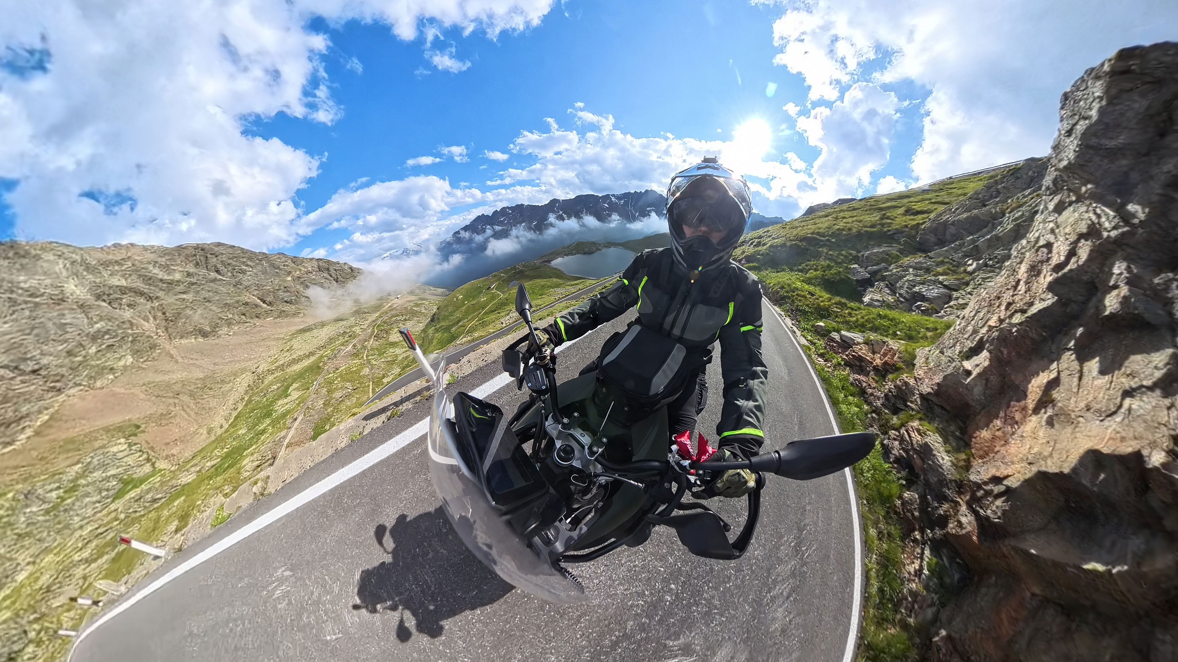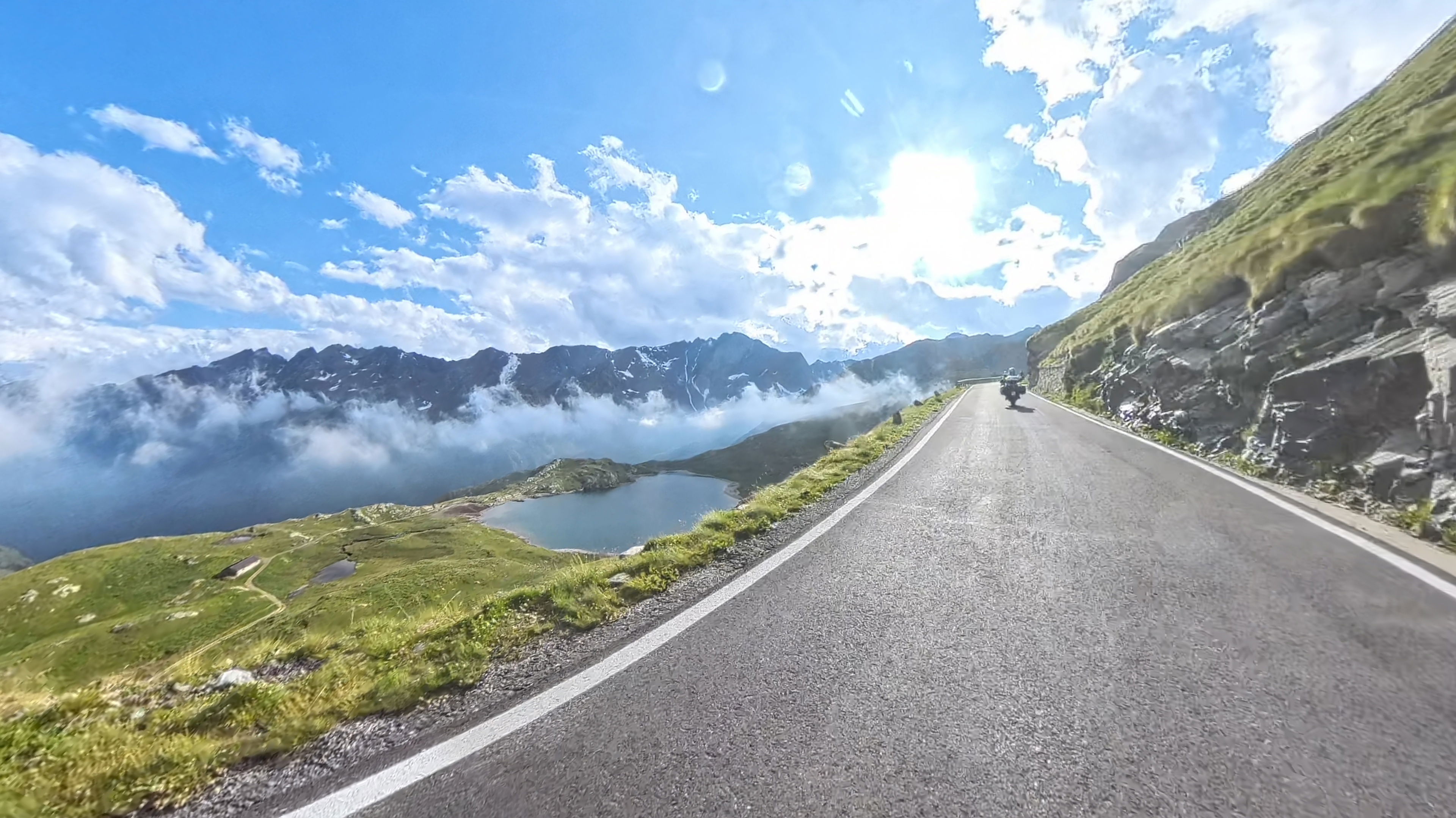 Sonček, brezvetrje, lepa panorama, ja, tukaj je prav idilično. Cesta preko prelaza je plačljiva. Fino je, ker lahko plačam za vse naenkrat in se ni treba vsakemu posebej ustavljati na rampi in kolebati s plačilom.