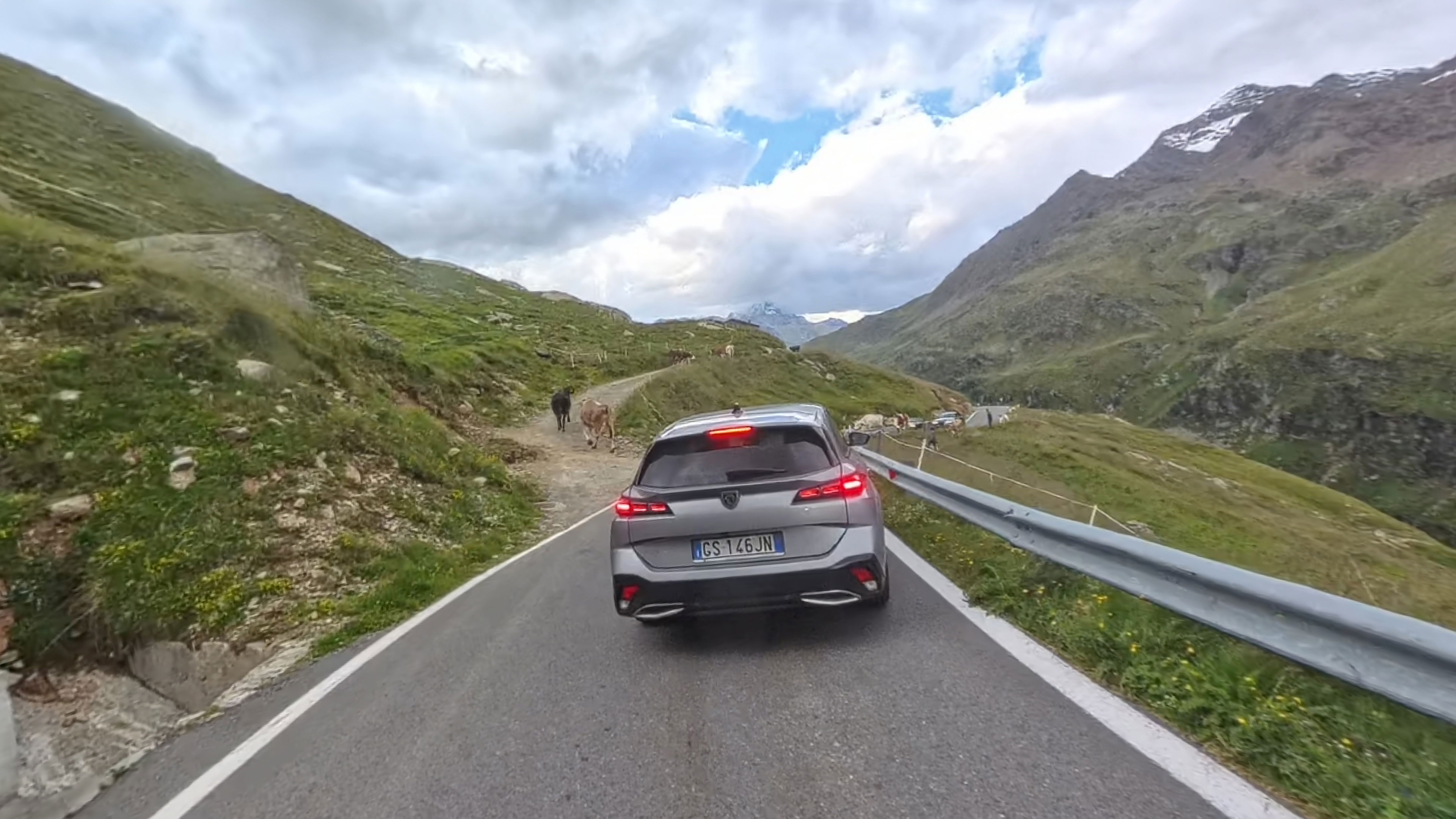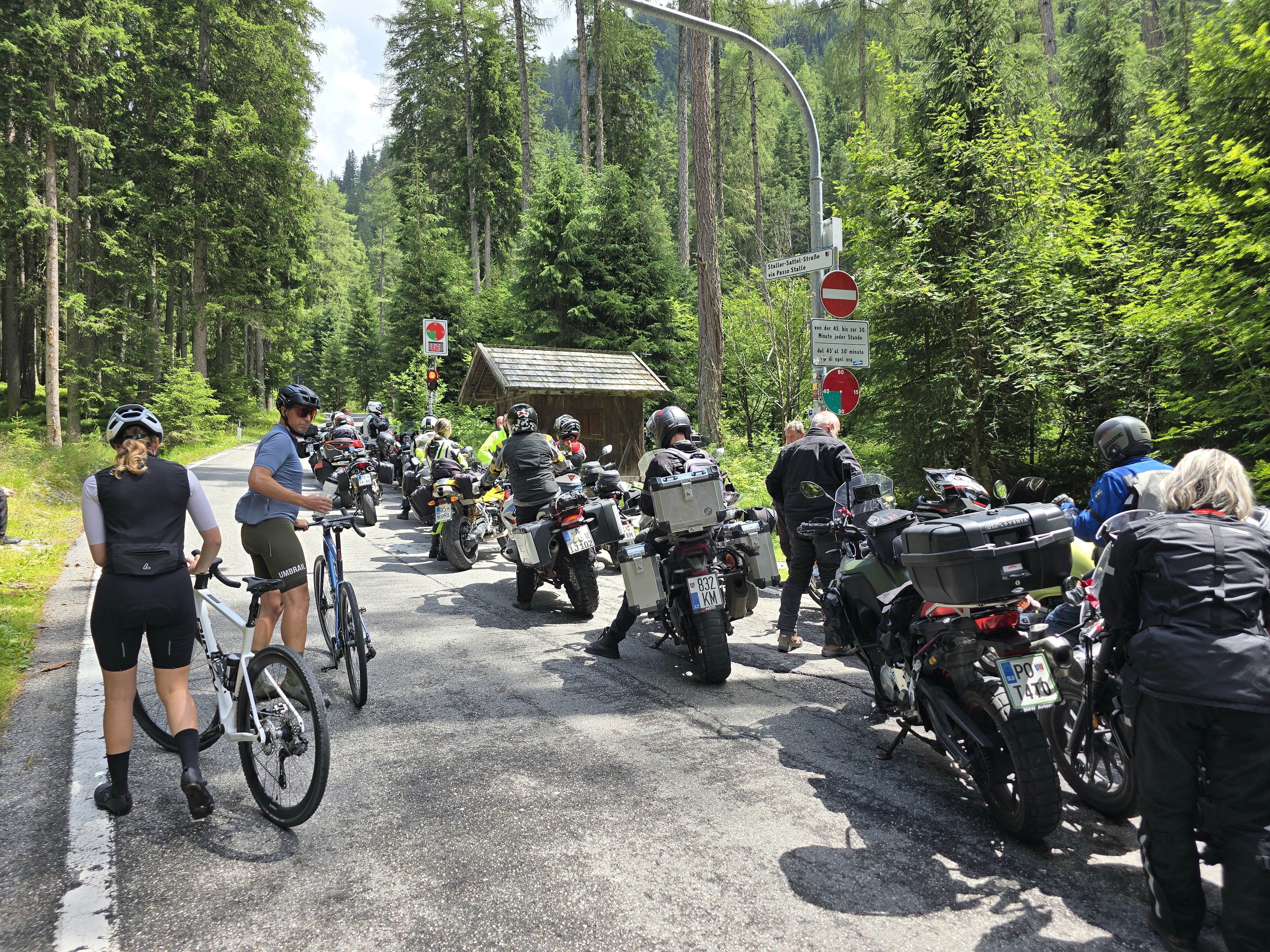 Ob vznožju ceste na prelaz Passo Stalle nas ustavi semafor, na katerem 45 minut sveti rdeča luč, 15 minut pa zelena. Cesta na prelaz je ozka, zato je bila to najlažja rešitev za ureditev prometa. Na zeleno luč čakamo le 10 minut, nato pa gas po ozki in strmi cesti.