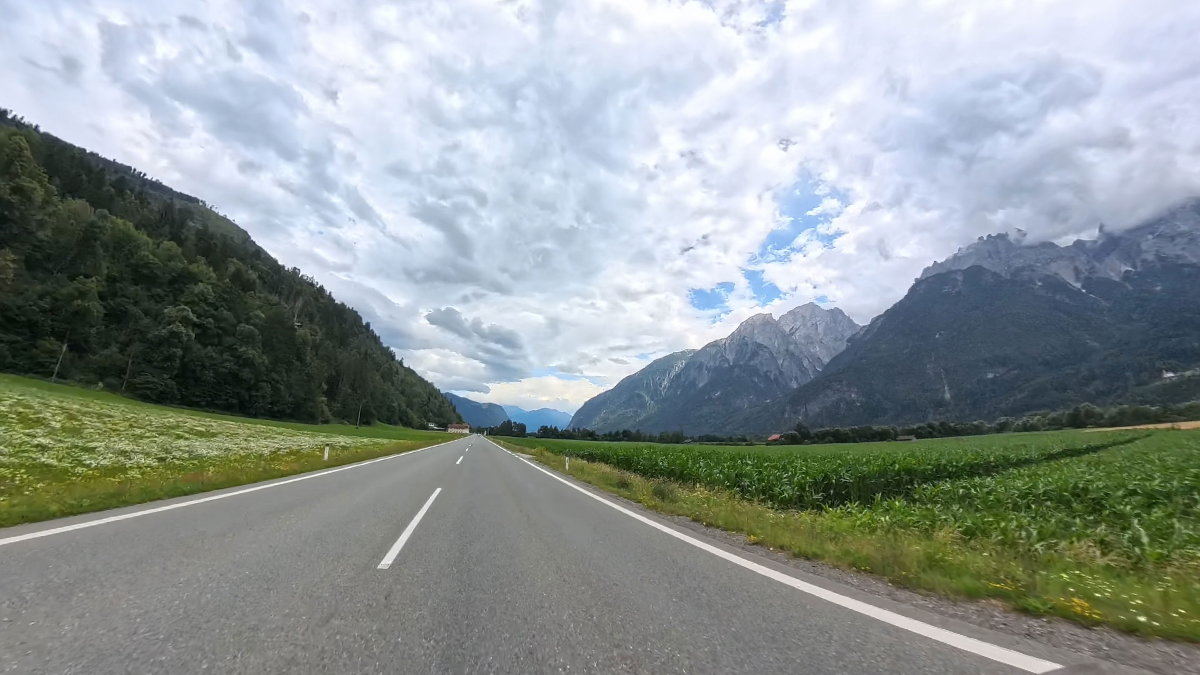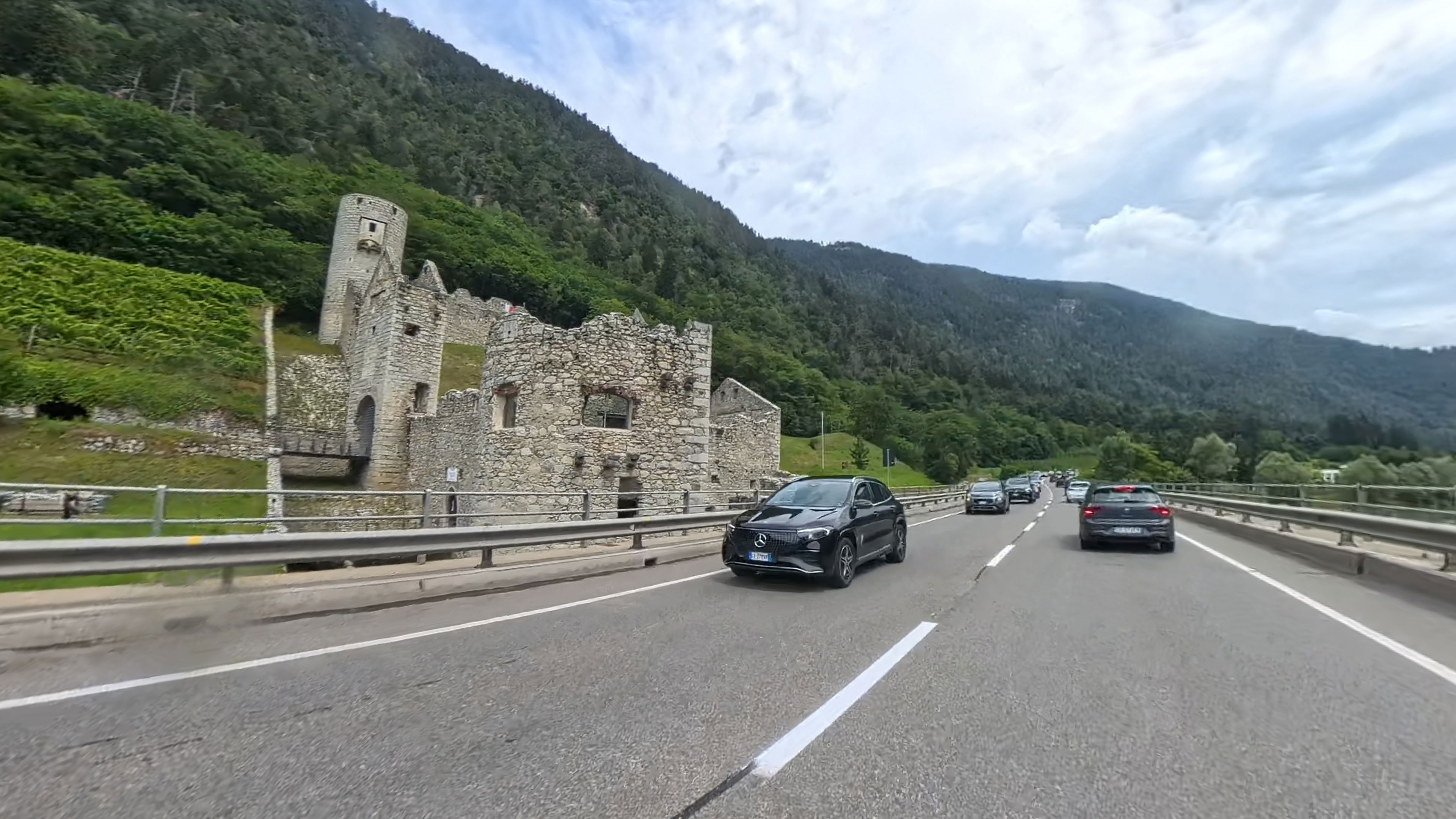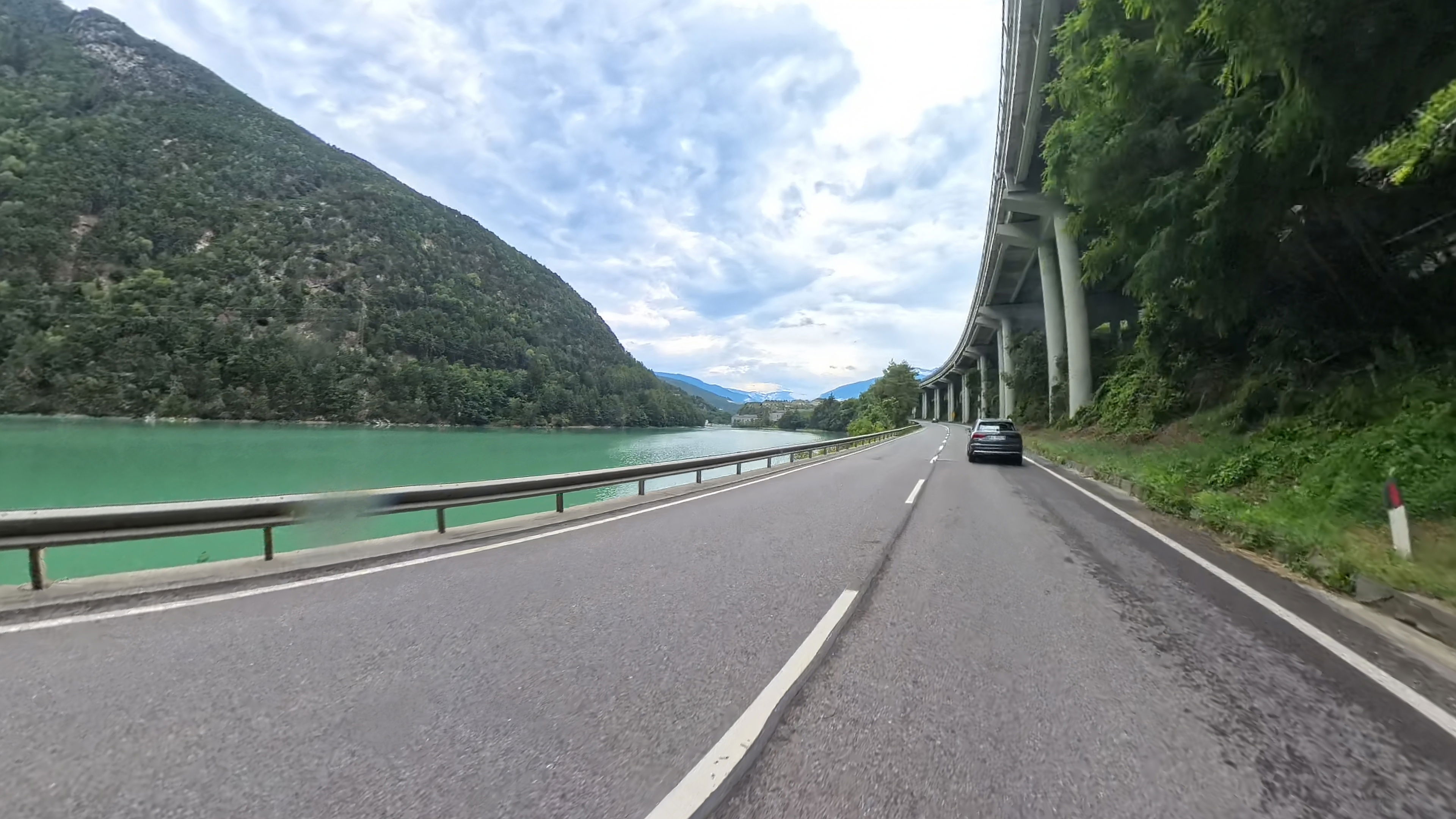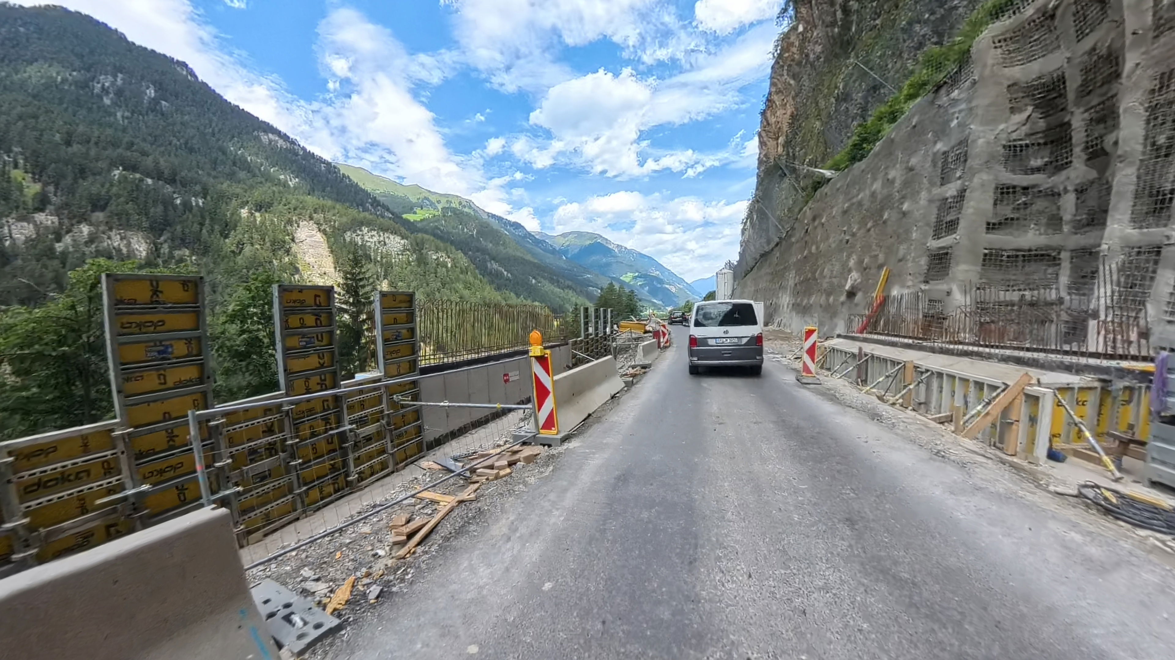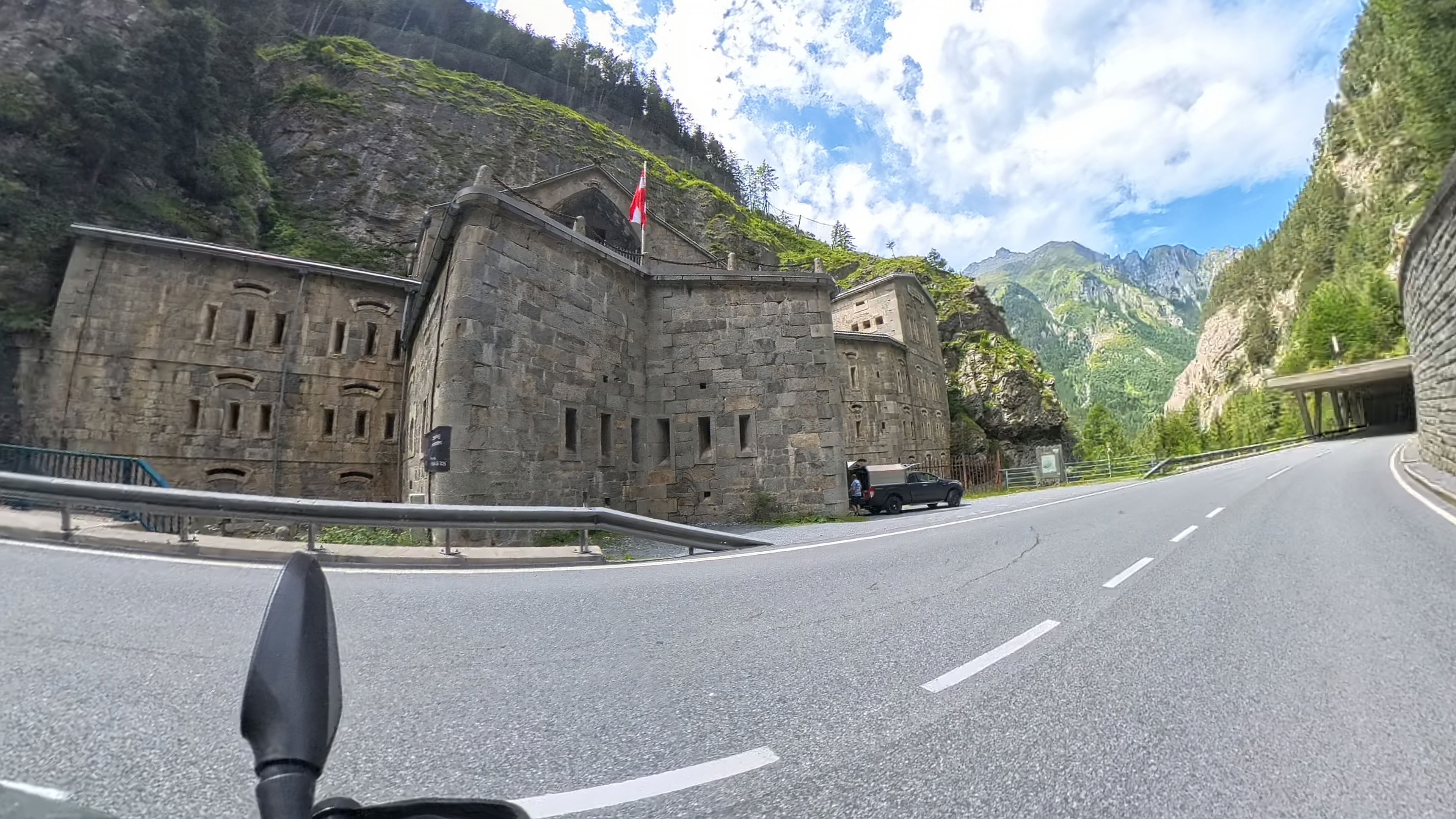 Privoščimo si kavo in pa hitro malico - nekateri hot-dog, drugi le ocvrt krompirček. Kmalu zatem prečkamo italijansko-avstrijsko mejo. Naprej od Naudersa rekonstruirajo cesto in moramo nekaj minut čakati na semaforju. Lani septembra se tukaj nismo mogli niti peljati, ker je bila popolna zapora in je bil ves promet preusmerjen na vzporedno cesto po švicarski strani.